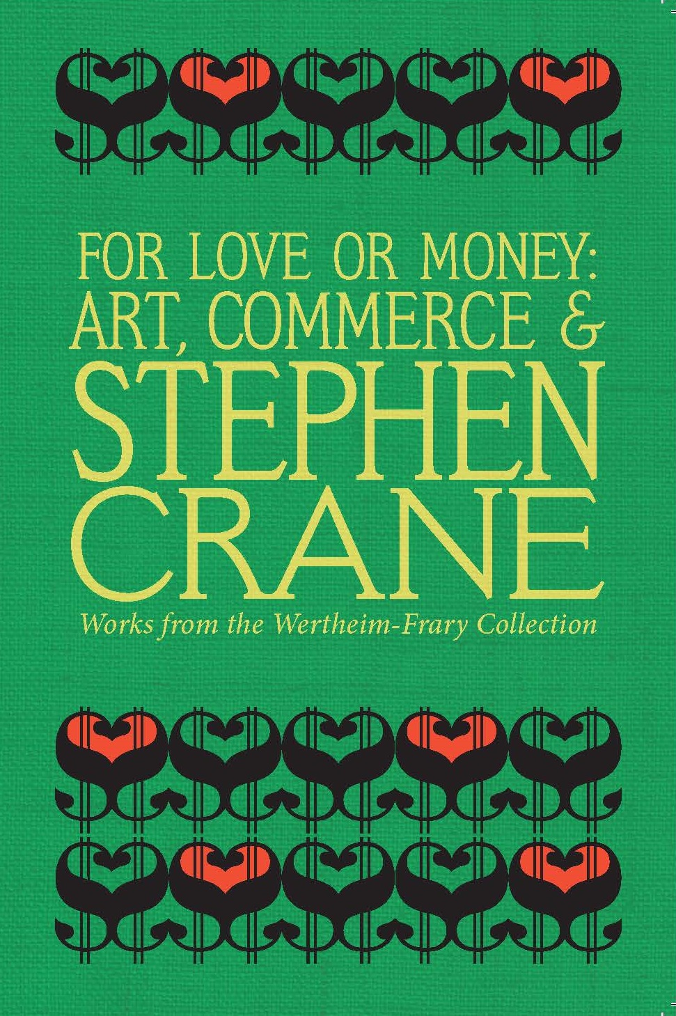 In 2013, I curated an exhibition about the American writer Stephen Crane, with curatorial fellows Jennie Hann and Doug Tye, Ph.D. candidates in the English Department. Criminy, did I come to love Crane. Some of his stories are masterful proto-Scott Fitzgerald gems… others are sloppy and quite clearly intended to please audiences rather than carry out some grand artistic design. (Commercial aspirations are also rather Fitzgeraldian, of course.) Rather than pretend the sloppy work did not exist, or attempt to explain it away, Jennie, Doug, and I decided to examine Crane’s career as a “professional” writer in an era when this designation did not yet ensure any kind of steady income (not that it does now). Hence the title, For Love or Money: Art, Commerce & Stephen Crane. Works from the Wertheim-Frary Collection. We also put together a catalog listing Wertheim-Frary collection highlights, with essays on Crane’s money troubles and commercial strategies.